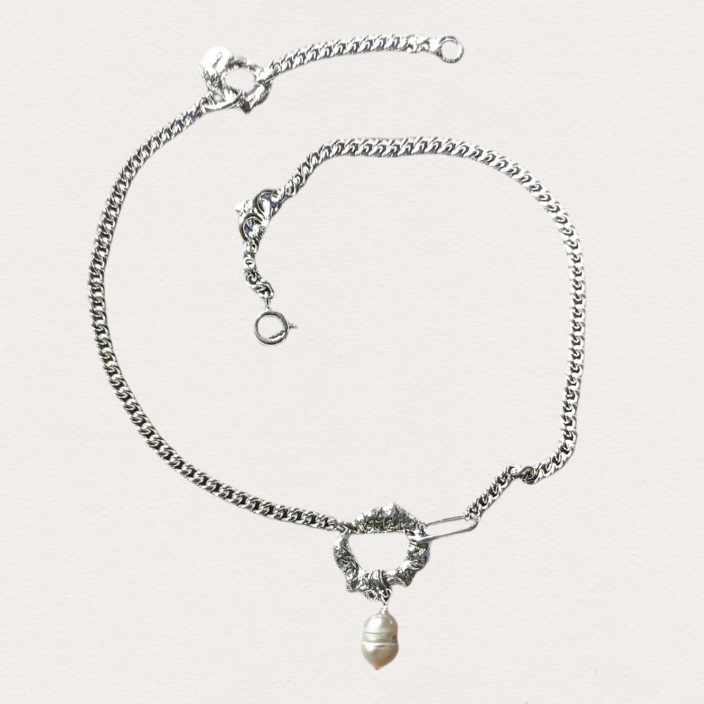 Handmade recycled sterling silver molten piece with Baroque Peal charm. Solid sterling silver curb chain. Roughly 40cm in length. One of a kind, never to be repeated.